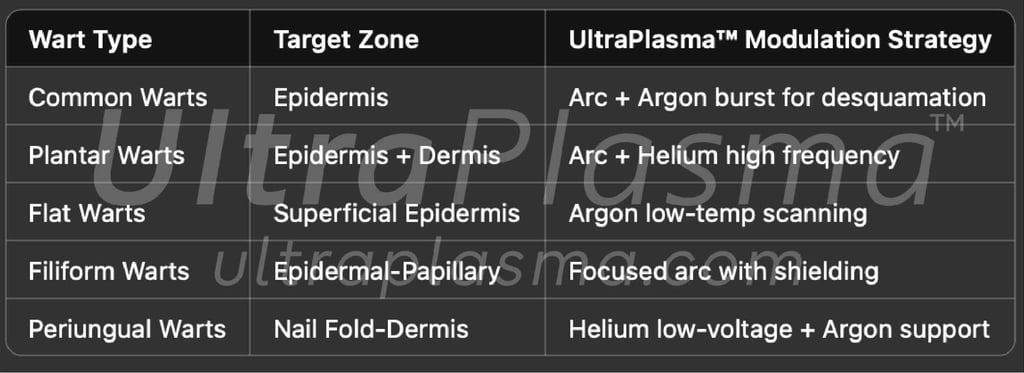 Their treatment requires both viral clearance and local tissue regeneration. UltraPlasma™, an advanced system that integrates arc, argon, and helium plasma technologies with a custom software and hardware-controlled output spectrum, introduces a novel multi-gas plasma therapeutic strategy tailored for effective wart removal, immunological modulation, and dermal regeneration.